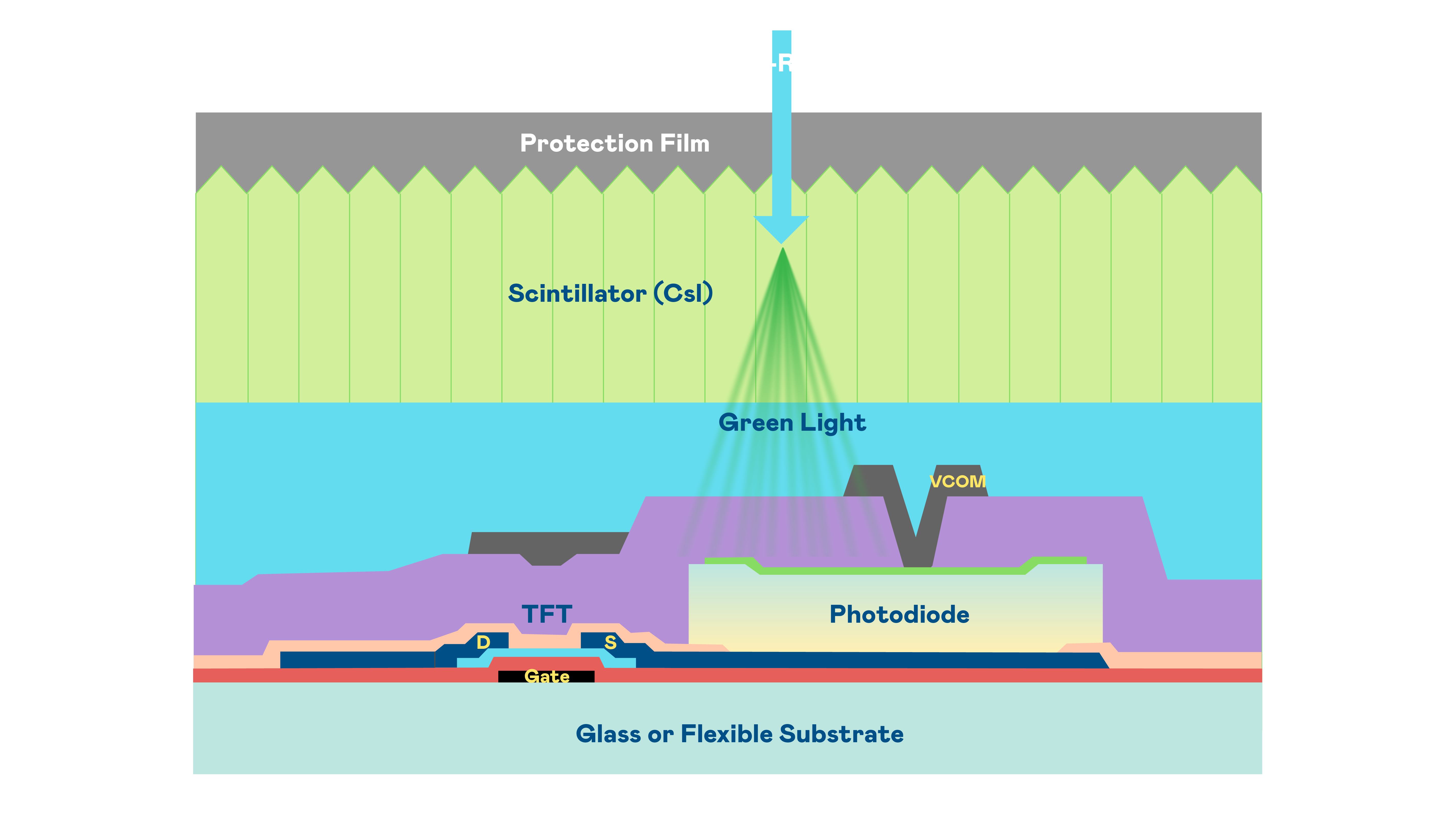 金年会的X光影像感測陣列使用薄膜電晶體 (TFT) 作為每個像素的讀取開關,搭配光電二極體(Photodiode)的光電轉換元件,用以感測X光影像訊號。